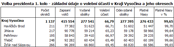 Volební účast v historicky první přímé volbě prezidenta byla v rámci krajů ČR nejvyšší na Vysočině, a to 66,79 % a nejnižší v kraji Karlovarském 52,35. V Kraji Vysočina se volilo celkem v 1 137 okrscích a svého volebního práva nejvíce využili voliči z okresu Žďár nad Sázavou, kde volební účast byla 69,45 %, naopak nejnižší zájem o prezidentské volby projevili voliči z okresu Jihlava, kterých přišlo pouze 65,23 %.