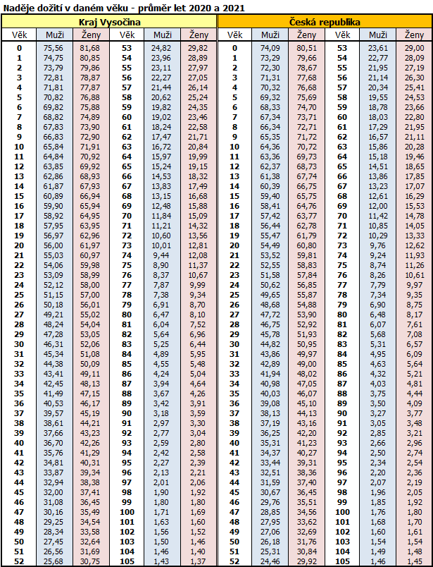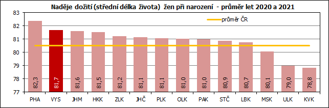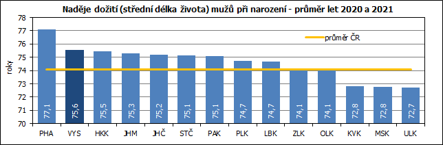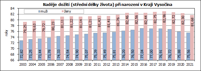 Údaje zjištěné z dvouletých průměrů let 2020 a 2021 udávají, že v Kraji Vysočina se muž narozený v roce 2021 pravděpodobně dožije věku 75 let a 7 měsíců, což představuje pokles zhruba o 4 měsíce proti předchozímu období. Vyšší naděje dožití při narození byla u mužů vypočtena pouze v Praze. Žena narozená v roce 2021 v Kraji Vysočina se pravděpodobně dožije 81 let a 8 měsíců, což je mezi kraji rovněž druhý nejvyšší věk za Prahou, pokles proti předchozímu období činí zhruba 8 měsíců.