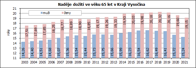 Muž, který žije v Kraji Vysočina a v roce 2021 dovršil 65 let, se pravděpodobně dožije dalších 15 let a 3 měsíců, pětašedesátiletá žena přibližně 19 let a 2 měsíců. Přes pokles naděje dožití v posledních letech lze i v této věkové kategorii spatřit nárůst, protože proti roku 2003 je u pětašedesátiletých zaznamenáno prodloužení naděje dožití o 1 rok u mužů a o 1 rok a osm měsíců u žen.