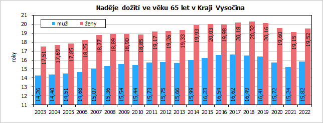 V roce 2022 pětačtyřicetileté muže z Vysočiny čeká pravděpodobně ještě 32 let a 9 měsíců, ženy stejného věku ještě o 5 let více. Muž, který žije v Kraji Vysočina a v roce 2022 dovršil 65 let, se pravděpodobně dožije dalších 15 let a 10 měsíců, pětašedesátiletá žena přibližně 19 let a 6 měsíců. Přes pokles naděje dožití v „covidových“ letech lze jako u všech věkových kategoriích i zde spatřit prodloužení střední délky života. Proti roku 2003 je u pětašedesátiletých zaznamenáno prodloužení naděje dožití o 1,5 roku u mužů a o 2 roky u žen.