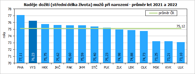 Po letech ovlivněných koronavirovou pandemií se naděje dožití mužů i žen ve všech krajích opět meziročně zvýšila. Muž narozený v Kraji Vysočina v roce 2022 se dožije pravděpodobně věku 76 let a 3 měsíců, žena 81 let a 11 měsíců. Vyšší naděje dožití při narození byla u mužů vypočtena pouze v Praze, u žen v Praze a Jihomoravském kraji.