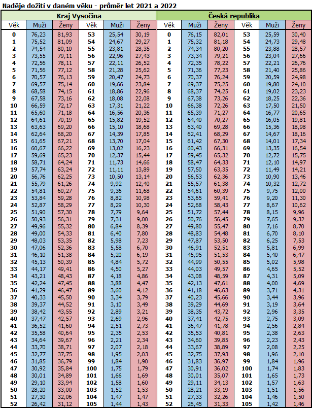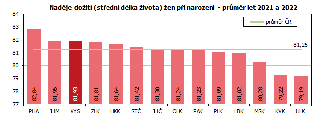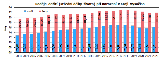 Údaje zjištěné z dvouletých průměrů let 2021 a 2022 udávají, že v Kraji Vysočina se muž narozený v roce 2022 pravděpodobně dožije věku 76 let a 3 měsíců, což představuje nárůst střední délky života o 8 měsíců proti předchozímu období. Vyšší naděje dožití při narození byla u mužů vypočtena pouze v Praze. Žena narozená v roce 2022 v Kraji Vysočina se dožije pravděpodobně 81 let a 11 měsíců, což je mezi kraji třetí nejvyšší věk za Prahou a Jihomoravským krajem. V předchozím období byla vypočtena naděje dožití zhruba o 3 měsíce kratší. Osmiměsíční meziroční přírůstek v roce 2022 u mužů a tříměsíční u žen navrací střední délku dožití po propadu posledních let na úroveň okolo roku 2014.