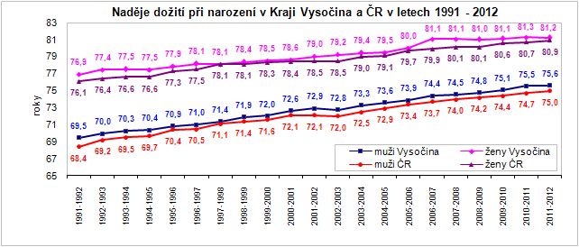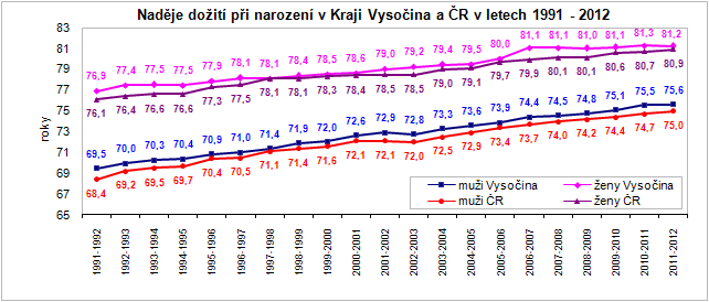 Naděje dožití při narození v Kraji Vysočina a ČR v letech 1991 až 2012