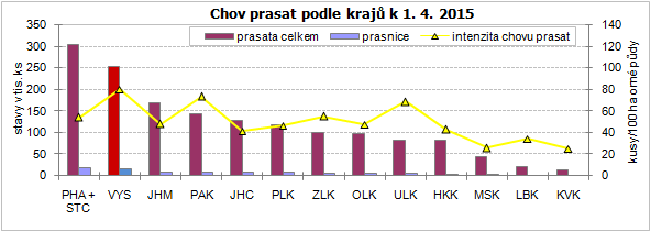Stavy prasat se v Kraji Vysočina od minulého šetření zvýšily o 5 600 kusů tj. o 2,3 %. V celé republice byl chov prasat omezen o 3,6 %, což bylo ovlivněno zejména vývojem ve Zlínském kraji, kde stavy prasat poklesly o jednu čtvrtinu. V Kraji Vysočina bylo dle soupisu chováno 253 451 kusů prasat, což je 16,3 % z celkových stavů v České republice. Relativně největší přírůstek byl zaznamenán v Ústeckém kraji, kde počet prasat vzrostl o 15 %. Nejméně prasat bylo chováno v Karlovarském kraji, zdejší chovy tvoří pouze jednu setinu početních stavů ČR. Podíl prasnic ve stádu prasat představoval na Vysočině 6,5 %, takže celkem bylo chováno 16 469 kusů.