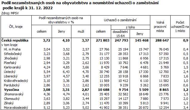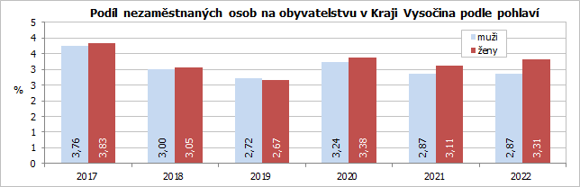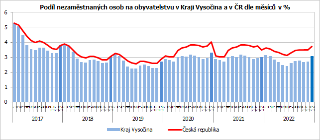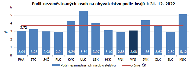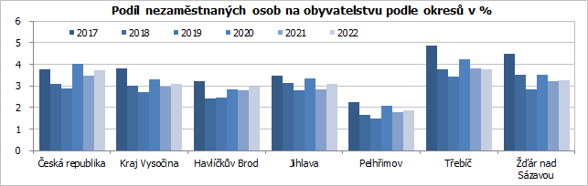 Na konci roku 2022 dosáhl podíl nezaměstnaných osob v Kraji Vysočina 3,08 %, když ještě ke konci listopadu 2021 činil 2,69 %. Proti roku 2021 bylo zaznamenáno zvýšení podílu o 0,09 bodu. V mezikrajském srovnání byl na Vysočině podíl nezaměstnaných šestý nejnižší a za republikovým průměrem zůstal o 0,64 bodu. Nejnižší podíl nezaměstnaných osob byl dlouhodobě vykazován v Praze, na konci roku 2022 se však hlavní město u tohoto ukazatele ocitlo až na pátém místě pomyslného pelotonu za Pardubickým, Zlínským, Plzeňským a Jihočeským krajem. Nejvyšší nezaměstnanost v minulých letech vykazoval Moravskoslezský kraj, na konci roku 2022 tomu však bylo jinak a nejvyšší podíl nezaměstnaných byl zaznamenán v Ústeckém kraji (5,54 %). Hranici tří procent na Vysočině podíl nezaměstnaných ke konci roku 2022 překonal v okresech Třebíč (3,77 %), Žďár nad Sázavou (3,27 %) a Jihlava (3,08 %), tradičně nejnižší byl na Pelhřimovsku (1,86 %).