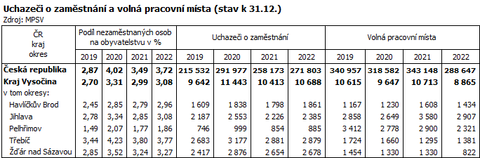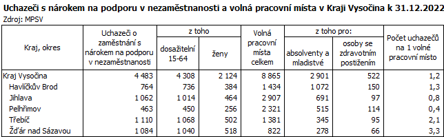 Nabídka volných pracovních míst v Kraji Vysočina dosáhla k 31. 12. 2022 počtu 8 865, což bylo o 1 848 méně než ke konci předchozího roku. Na jedno volné pracovní místo tak připadalo v průměru 1,2 uchazeče. Pro občany se zdravotním postižením bylo k dispozici 522 volných pracovních míst a pro absolventy a mladistvé 2 901 míst.