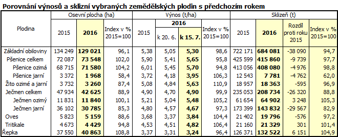 Hlavní obilovinou je ozimá pšenice, kde se očekává sklizeň ve výši 416 tis. tun, což je o 5 tis. tun (1,2 %) méně než při sklizni v roce 2015. Předpokladem je dosažení hektarového výnosu na úrovni 5,70 tun. Odhadovaný výnos je o 0,31 t/ha nižší než při sklizni v loňském roce.