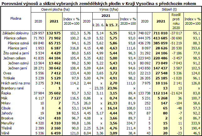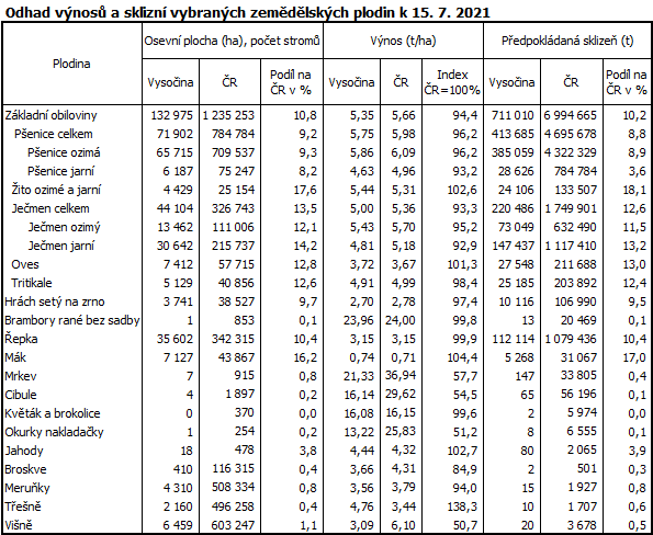 Odhady výnosů a sklizní zemědělských plodin v Kraji Vysočina k 15. 7. 2021