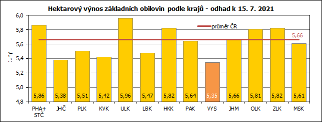 Podle druhého letošního odhadu bude na Vysočině sklizeno 711 tis. tun základních obilovin. Při porovnání s loňským rokem je to o 37 tis. tun méně, tj o 4,9 %. Důvodem je nižší hektarový výnos (-7,1 %), protože osevní plocha se rozšířila o 2,3 %. Hektarový výnos základních obilovin je odhadován na úrovni 5,35 tun, což je o 0,41 tuny méně, než bylo sklizeno z jednoho hektaru loni.