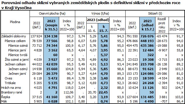 Podle druhého letošního odhadu bude na Vysočině v porovnání s loňskou sklizní sklizeno o 8,3 % méně základních obilovin (pšenice, žita, ječmene, ovsa a tritikale). Jedinou z těchto obilovin, u níž se očekává vyšší sklizeň než v loňském roce, je ječmen ozimý (+3,3 %). Nižší je odhadována i sklizeň máku (-13,6 %). Řepky se dle odhadů sklidí o 3 % více než loni.
