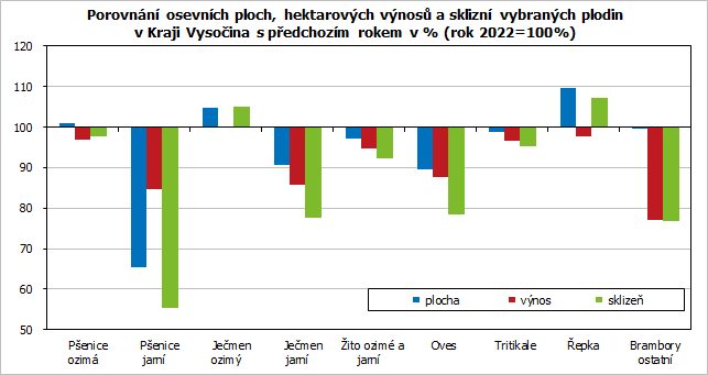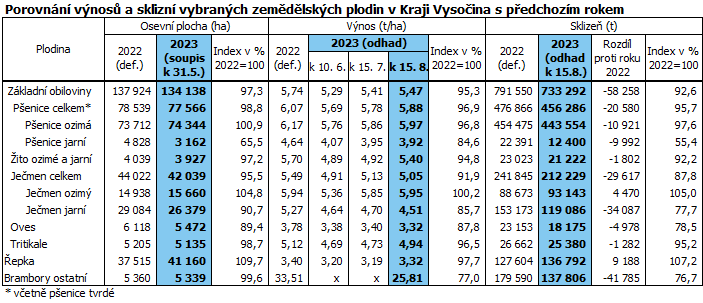 Podle zpřesněných odhadů k 15. srpnu 2023 bude sklizeň základních obilovin v Kraji Vysočina v porovnání s loňskou sklizní až o 58 tis. tun (-7,4 %) nižší. Propad sklizně se očekává u všech jednotlivých druhů základních obilovin, až na ječmen ozimý. Ve sklizni brambor (mimo raných a sadbových) se projeví meziročně skoro o čtvrtinu nižší očekávaný hektarový výnos, sklidí se jich 138 tis. tun, o 42 tis. tun (-23,3 %) méně než v roce 2022. Řepky se dle odhadů naopak sklidí o 9 tis. tun (+7,2%) více.