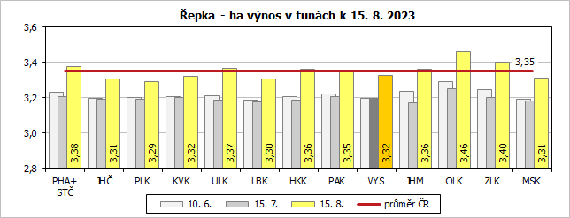 - Odhady sklizně - operativní zpráva - k 15. 8. 2023Odhady sklizně zemědělských plodin za ČR a jednotlivé kraje v ukazatelích: hektarový výnos (v t/ha) a celková sklizeň (propočet z odhadovaného hektarového výnosu a osevní plochy). Porovnání s předchozím rokem.