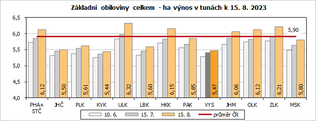 Podle odhadů provedených k 15. srpnu 2023 lze v Kraji Vysočina očekávat, že letošní sklizeň základních obilovin bude v porovnání se skutečností loňského roku nižší, a to až o 58 tis. tun (-7,4 %). U pšenice ozimé, na největší osevní ploše (74 344 hektarů) pěstované obilovině, se sice očekává propad sklizně o necelých 11 tis. tun (-2,4 %), ale už u druhé nejčastěji seté obiloviny - ječmene jarního - se předpokládá propad sklizně až o čtvrtinu, konkrétně o 34 tis. tun (-22,3 %). U ječmene jarního je totiž předpokládán meziročně o 4,3 % nižší výnos z 1 ha a navíc byl vyset na ploše o 9,3 % menší. Propad sklizně se na Vysočině očekává u všech jednotlivých druhů základních obilovin, až na ječmen ozimý.