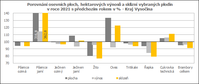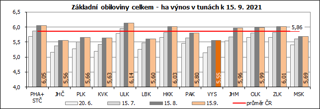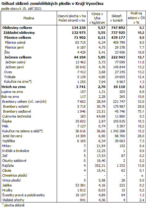 Sklizeň obilovin by měla přesáhnout hranici 748 tis. tun při průměrném výnosu 5,57 t/ha. Proti skutečnosti roku 2020 to znamená snížení hektarového výnosu o více než dva metráky a celkové produkce o 18 tis. tun. Z dlouhodobého pohledu se jedná o nadprůměrnou sklizeň. Na dosaženém výsledku se nejvíce podílí ozimá pšenice, která je pěstována na největší ploše při předpokládaném výnosu 6,11 t/ha. Vyšší výnos než loni je očekáván pouze u ovsa a jarních odrůd pšenice a ječmene.