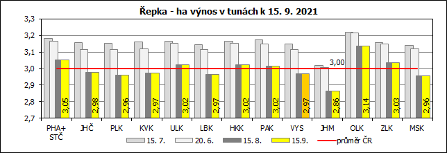 Proti předchozímu roku je výrazně nižší produkce řepky, její plocha se zmenšila o 2 382 hektarů a hektarový výnos ve výši 2,97 t/ha byl o 15,7 % pod úrovní loňského roku. Podle odhadů je sklizeno 106 tis. tun této plodiny, což je o jednu pětinu méně než v minulém roce. Z dlouhodobého pohledu se u této plodiny jedná o osmý nejvyšší výnos a sedmou nejnižší sklizeň. Produkce máku se zvýší při nárůstu osevních ploch (i přes pokles výnosu) na 5,3 tis. tun, tj. asi 18 % sklizně této plodiny v celé České republice (nejvíce po Středočeském kraji).