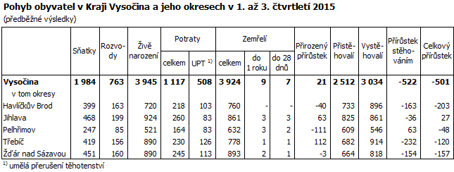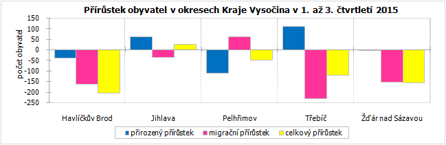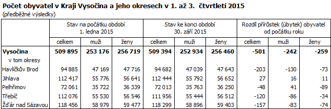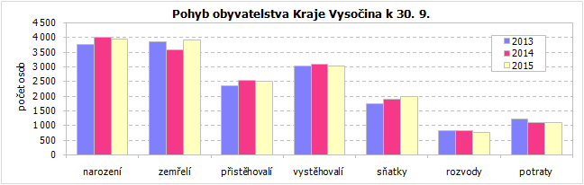 Ke konci září 2015 žilo v Kraji Vysočina 509 394 obyvatel, což bylo oproti stavu na začátku roku o 501 osob méně (v mezikrajském srovnání šestý nejvyšší úbytek). Celkový pokles počtu obyvatel byl způsoben negativním saldem migrace, které ani zdaleka nemohl vyvážit nevelký přírůstek obyvatel přirozenou měnou. Do kraje se přistěhovalo 2 512 osob, vystěhovalých bylo 3 034. Živě se v kraji za prvních devět měsíců roku 2015 narodilo 3 945 dětí, z toho 41,8 % mimo manželství. Ve stejném období zemřelo 3 924 osob, přirozenou měnou tak přibylo 21 obyvatel.