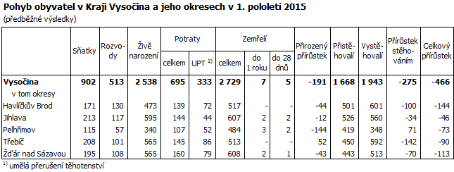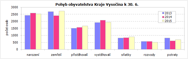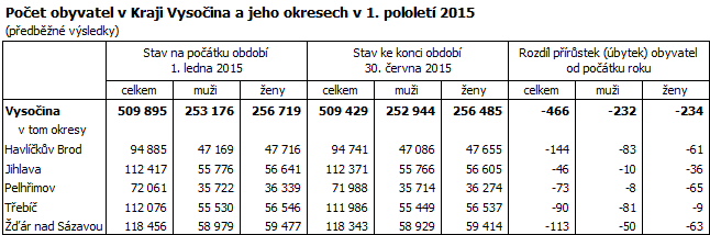 Ke konci června 2015 žilo v Kraji Vysočina 509 429 obyvatel, což bylo oproti stavu na začátku roku o 466 osob méně (v mezikrajském srovnání šestý nejvyšší úbytek). Celkový pokles počtu obyvatel byl způsoben jak negativním saldem migrace, tak i úbytkem obyvatel přirozenou měnou. Do kraje se přistěhovalo 1 668 osob, vystěhovalých bylo 1 943. Živě se v kraji za prvních šest měsíců roku 2015 narodilo 2 538 dětí, z toho 42,2 % mimo manželství. Ve stejném období zemřelo 2 729 osob, přirozenou měnou tak ubylo 191 obyvatel.