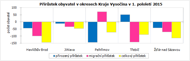 Celkový pokles počtu obyvatel se projevil ve všech okresech kraje, nejvíce na Havlíčkobrodsku. Stěhováním ubylo nejvíce obyvatel v okrese Třebíč (-142), kladné migrační saldo bylo zjištěno pouze v pelhřimovském okrese.