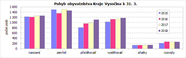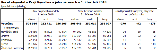 Ke konci března 2018 žilo v Kraji Vysočina 508 646 obyvatel, což bylo oproti stavu na začátku roku o 270 osob méně (v mezikrajském srovnání šestý nejvyšší úbytek). Za celkovým poklesem obyvatel tentokrát stojí úbytek obyvatelstva přirozenou měnou, který ještě prohloubilo negativní migrační saldo. Do kraje se přistěhovalo 1 106 osob, vystěhovalých bylo 1 179. Živě se v kraji za první tři měsíce roku 2018 narodilo 1 264 dětí, z toho 43,8 % mimo manželství. Ve stejném období zemřelo 1 461 osob, přirozenou měnou tak ubylo 197 obyvatel.