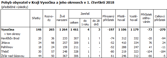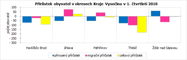 Celkový pokles populace se projevil ve většině okresů kraje s výjimkou Jihlavska, kde přibylo 24 obyvatel. O nejvíce obyvatel přišlo Třebíčsko (-184), kde se spojil úbytek obyvatel přirozenou měnou s negativním migračním saldem, v obou případech jde v rámci kraje o nejvyšší úbytky. Ze všech okresů kraje to byl nejvyšší úbytek stěhováním. Počet přistěhovalých obyvatel převýšil v prvním čtvrtletí roku 2018 množství vystěhovalých pouze v jihlavském (o 76 osob) a pelhřimovském okrese (o 41 osob).