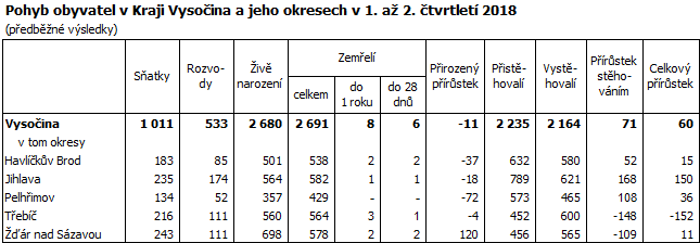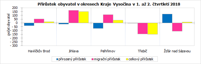 Celkový pokles populace se projevil v jediném okrese kraje, třebíčském, kde ubylo 152 obyvatel. Nejvíce obyvatel přibylo v okrese Jihlava (150), kde úbytek obyvatel přirozenou měnou převážilo kladné migrační saldo, nejvyšší v kraji. Počet přistěhovalých obyvatel převýšil v prvním pololetí roku 2018 množství vystěhovalých ještě v pelhřimovském (o 108 osob) a havlíčkobrodském okrese (o 52 osob).