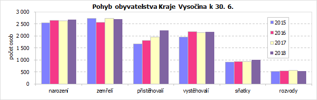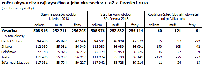 Ke konci června 2018 žilo v Kraji Vysočina 508 976 obyvatel, což bylo oproti stavu na začátku roku o 60 osob více (v mezikrajském srovnání osmý nejvyšší přírůstek). Za celkovým přírůstkem obyvatel tentokrát stojí kladné migrační saldo, které dokázalo převážit nepatrný úbytek populace přirozenou měnou. Do kraje se přistěhovalo 2 235 osob, vystěhovalých bylo 2 164. Živě se v kraji za prvních šest měsíců roku 2018 narodilo 2 680 dětí, z toho 44,3 % mimo manželství. Ve stejném období zemřelo 2 691 osob, přirozenou měnou tak ubylo 11 obyvatel.