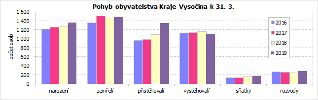 Ke konci března 2019 žilo v Kraji Vysočina 509 389 obyvatel, což bylo oproti stavu na začátku roku o 115 osob více (v mezikrajském srovnání pátý nejvyšší přírůstek). Za celkovým přírůstkem obyvatel stojí výhradně kladné migrační saldo, přirozenou měnou ubylo na Vysočině 119 obyvatel. Do kraje se přistěhovalo 1 350 osob, vystěhovalých bylo 1 116. Živě se v kraji v prvních třech měsících roku 2019 narodilo 1 358 dětí, z toho 47,0 % mimo manželství (v meziročním srovnání o 3,3 procentního bodu více). Ve stejném období zemřelo 1 477 osob, přirozenou měnou tak ubylo 119 obyvatel.