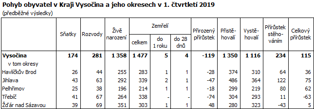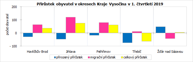 Celkový pokles populace se projevil v jediném okrese kraje, třebíčském, kde ubylo 63 obyvatel. Nejvíce obyvatel přibylo v okresech Jihlava (75) a Pelhřimov (62), kde nevelký úbytek, obyvatel přirozenou měnou doprovázelo poměrně vysoké kladné migrační saldo. Počet přistěhovalých obyvatel převýšil v prvním čtvrtletí roku 2019 množství vystěhovalých ve všech okresech kraje s výjimkou žďárského (-43 osob).