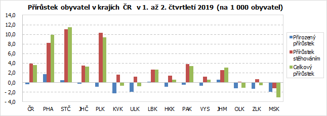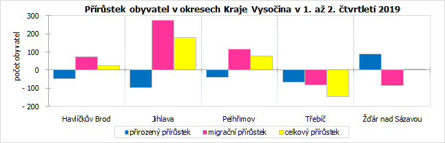 Celkový pokles populace se projevil v jediném okrese kraje, třebíčském, kde ubylo 148 obyvatel. Nejvíce obyvatel přibylo v okrese Jihlava (179) a Pelhřimov (62), kde vyšší úbytek obyvatel přirozenou měnou zvrátilo vysoké kladné migrační saldo. Počet přistěhovalých obyvatel převýšil v prvním pololetí roku 2019 množství vystěhovalých ve třech okresech kraje, migrační úbytek se projevil na Třebíčsku a Žďársku.