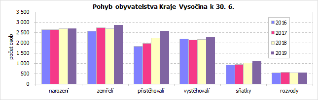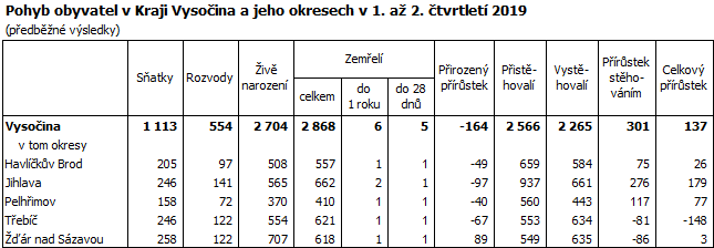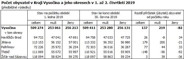 Ke konci června 2019 žilo v Kraji Vysočina 509 411 obyvatel, což bylo oproti stavu na začátku roku o 137 osob více (v mezikrajském srovnání devátý nejvyšší přírůstek). Za celkovým přírůstkem obyvatel stojí výhradně kladné migrační saldo, přirozenou měnou ubylo na Vysočině 164 obyvatel. Do kraje se přistěhovalo 2 566 osob, vystěhovalých bylo 2 265. Živě se v kraji v prvních šesti měsících roku 2019 narodilo 2 704 dětí, z toho 46,3 % mimo manželství (v meziročním srovnání o 2,0 procentní body více). Ve stejném období zemřelo 2 868 osob, přirozenou měnou tak ubylo 164 obyvatel.