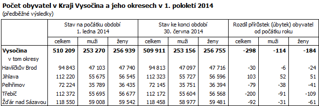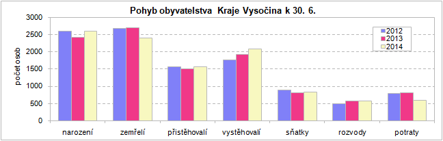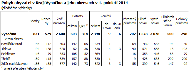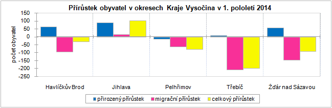 V průběhu prvního pololetí 2014 se v Kraji Vysočina narodilo 2 600 dětí, což bylo o 176 narozených dětí více než ve stejném období předchozího roku. V lednu až červnu 2014 na Vysočině zemřelo 2 398 osob, oproti prvnímu pololetí roku 2013 to představuje pokles o 296 osob. Počet zemřelých osob převýšil počet narozených pouze v okrese Pelhřimov, kde přirozenou měnou ubylo 16 obyvatel. Nejvyšší přirozený přírůstek počtu obyvatel byl v okrese Jihlava (90 osob).