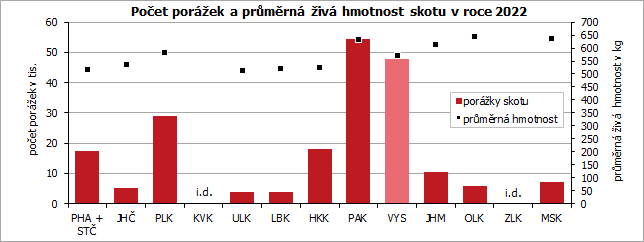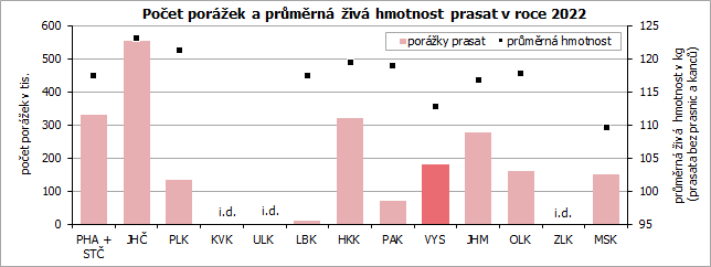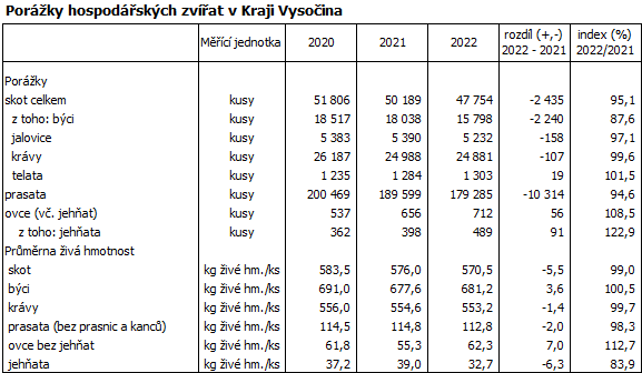 V loňském roce bylo v Kraji Vysočina poraženo celkem 47 754 kusů skotu, což je o 2 435 kusů méně než v roce 2021 (index 95,1 %). V mezikrajském srovnání se jedná o druhý nejvyšší počet poražených kusů skotu. Průměrná živá hmotnost jednoho poraženého kusu skotu činila 570,5 kg a oproti stejnému období loňského roku poklesla o 5,5 kg (index 99 %). Pokles o 5,4 %, tj. o 10 314 ks, byl zaznamenán u porážek prasat. Celkem bylo v roce 2021 na Vysočině poraženo 179 285 kusů prasat. Průměrná hmotnost prasat (bez prasnic a kanců) se meziročně snížila o 2 kg na 112,8 kg.