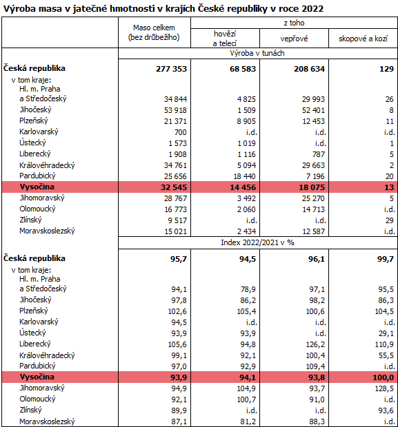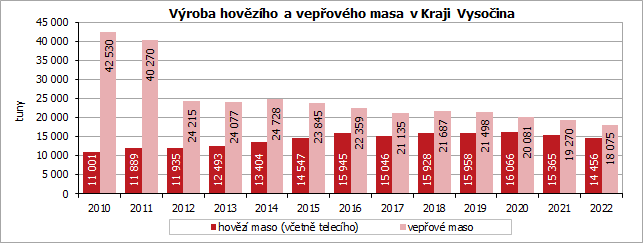 Vepřového masa podniky z Vysočiny na trh dodaly 18 075 tun, což bylo o 6,2 % méně než v roce 2021. Je to páté nejvyšší množství v republice (podíl 8,7 %). Na celkové produkci masa v Kraji Vysočina se vepřové maso podílí 55,5 %. V loňském roce byla Vysočina po kraji Pardubickém druhým největším výrobcem masa hovězího a telecího (s podílem 21,1 %), kterého bylo vyprodukováno 14 456 tun, což představuje meziroční pokles o 5,9 %. Podíl z celkové výroby masa v kraji to představuje 44,4 %. Masa skopového a kozího bylo vyrobeno 13 tun, stejné množství jako v roce předchozím. Na produkci tohoto druhu masa v České republice se Vysočina podílí 10,1 %.