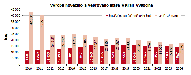 Vepřového masa podniky z Vysočiny na trh dodaly 17 789 tun, což bylo o 9,8 % více než v roce 2023. Je to páté nejvyšší množství v republice (podíl 8,4 %). Na celkové produkci masa v Kraji Vysočina se vepřové maso podílí 55 %. V loňském roce byla Vysočina po kraji Pardubickém druhým největším výrobcem masa hovězího a telecího (s podílem 21,2 %). Bylo ho zde vyprodukováno 14 567 tun, meziročně o 2,8 % méně. Podíl z celkové výroby masa v kraji to představuje 45 %. Masa skopového a kozího bylo vyrobeno 14 tun, přibližně o jednu tunu více než v roce předchozím (+7 %). Na produkci tohoto druhu masa v České republice se Vysočina podílí z 12,2 %.