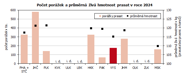 V loňském roce bylo v Kraji Vysočina poraženo celkem 47 636 kusů skotu, což je o 1 549 kusů méně než v roce 2023 (-3,1 %). V mezikrajském srovnání se jedná o druhý nejvyšší počet poražených kusů skotu po kraji Pardubickém. Průměrná živá hmotnost jednoho poraženého kusu skotu činila 577 kg a oproti předchozímu roku se zvýšila o 2,5 kg (+0,4 %). Nárůst o 6,1 %, tj. o 10 074 ks, byl zaznamenán u porážek prasat. Celkem bylo v roce 2024 na Vysočině poraženo 176 033 ks prasat. Průměrná hmotnost prasat (bez prasnic a kanců) meziročně vzrostla o 2,7 kg (+2,4 %) na 115,2 kg živé hmotnosti na 1 kus.