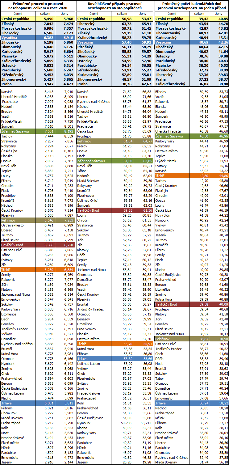 V Kraji Vysočina bylo v roce 2020 v průměru denně 11 294 práce neschopných osob (o 1 700 více než v roce 2019), z toho pro nemoc 9 763 osob, 372 z důvodu pracovních úrazů a 1 159 pro ostatní úrazy.