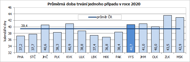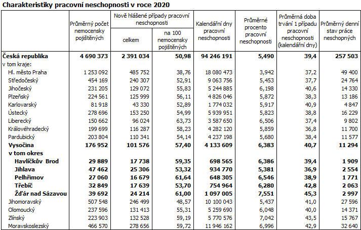 Průměrná délka trvání jednoho případu pracovní neschopnosti činila v Kraji Vysočina 40,7 kalendářních dnů, což je o 4,9 dne méně než v předchozím roce. Délka pracovní neschopnosti je na Vysočině nad průměrem ČR. Z jednotlivých okresů Kraje Vysočina byla nejvyšší délka trvání jednoho případu zaznamenána v okrese Žďár nad Sázavou (45,3) a nejkratší v okrese Jihlava (36,9). V mezikrajském porovnání byla nejkratší průměrná doba trvání pracovní neschopnosti 36,8 dne vykázána v roce 2020 v Královéhradeckém kraji, nejdelší ve Zlínském kraji, a to 43,5 dne.