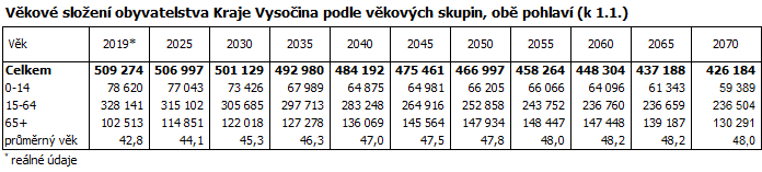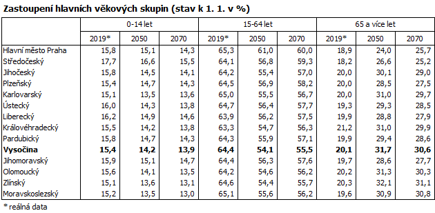 Projekce ukazuje též pokračující proměnu věkové struktury obyvatelstva a další stárnutí populace Vysočiny. Podíl dětí mladších 15 let by měl klesnout na minimum kolem roku 2040 (13,4 % z celkového počtu obyvatel kraje), v následujících dekádách by pak kolísal kolem 14,0 %. Ještě hlubší bude podle prognózy úbytek obyvatel v produktivním věku (15 až 64 let), jehož podíl na populaci kraje by měl v roce 2070 činit 55,6 % (o 8,8 procentního bodu méně než v roce 2019). Naproti tomu dále poroste podíl obyvatelstva ve věku 65 a více let, které by se v roce 2070 mělo na populaci Vysočiny podílet více než třiceti procenty – podíl o polovinu vyšší než v roce 2019. Podíl nejstarších obyvatel tak bude na Vysočině mezi regiony České republiky po Zlínském kraji druhý nejvyšší.