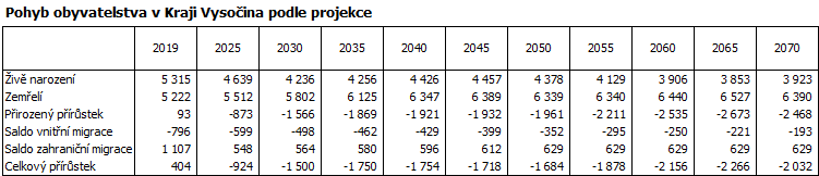 Podle projekce bude v Kraji Vysočina přirozený přírůstek v celém sledovaném období dosahovat záporných hodnot, přičemž u výše úbytku by se měla projevovat rostoucí tendence – podle projekce bude po roce 2060 na Vysočině přirozenou měnou ubývat více než 2 600 osob ročně. Více než o čtvrtinu by měl poklesnout počet narozených, naopak počet zemřelých má podle projekce vzrůst více než o pětinu. Saldo migrace by díky imigraci ze zahraničí mělo v průběhu dvacátých let přejít do kladných hodnot, ve kterých by podle projekce zůstalo až do konce období. Přesto migrace dokáže celkový úbytek obyvatel kraje pouze zmírnit.