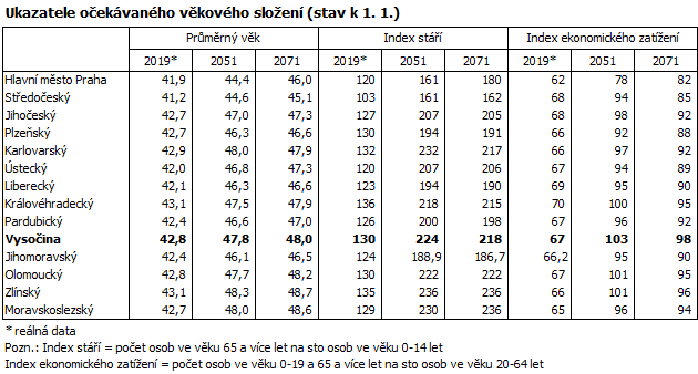 Průměrný věk v Kraji Vysočina se v horizontu projekce zvýší o více než pět let a od poloviny padesátých let by se měl pohybovat kolem 48 let. Na konci horizontu bude podle projekce po Zlínském, Olomouckém a Moravskoslezském kraji v regionálním srovnání čtvrtý nejvyšší. Růst bude také index ekonomického zatížení, který porovnává počet osob ve věku 65 + a 0 - 19 let s počtem osob ve věku 20 - 64 let. Index bude směřovat k početnímu vyrovnání (100) těchto dvou složek populace. Hodnota indexu v kraji by měla z 67,1 v roce 2019 vzrůst až na 109,4 v roce 2059. Na počátku roku 2071 by měla hodnota tohoto indexu na Vysočině činit 97,8, v obou případech by šlo v mezikrajském srovnání o nejvyšší hodnoty.
