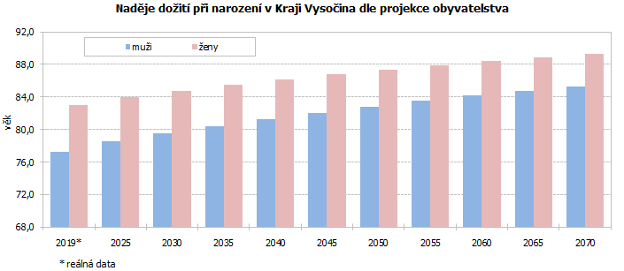 Naděje dožití při narození vzroste podle projekce v Kraji Vysočina u mužů ze 77,3 v roce 2019 na 85,3 roku v roce 2070 a u žen z 83,0 na 89,4 roku. Rozdíl v naději dožití při narození u mužů a žen by se tedy měl snížit z 8 let v roce 2019 na 6,4 roku v roce 2070. Naděje dožití při narození mužů a žen zůstává v rámci ČR na Vysočině stabilně nadprůměrná.
