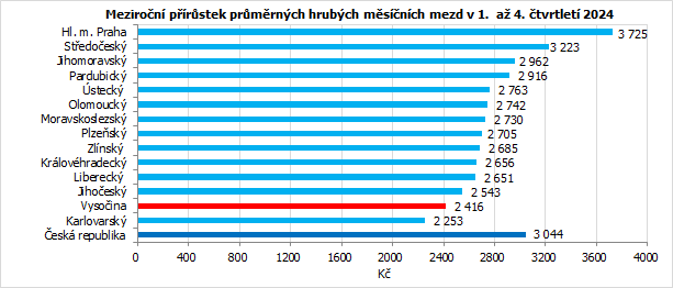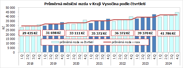 Na Vysočině dosáhla průměrná hrubá měsíční nominální mzda na přepočtené počty zaměstnanců za dvanáct měsíců roku 2024 částky 41 786 Kč, což proti stejnému období předchozího roku představuje nárůst o 6,1 %, v absolutním vyjádření se jedná o zvýšení o 2 416 Kč.
