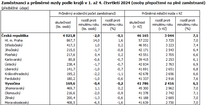 Počet zaměstnanců se na republikové úrovni prakticky nezměnil, na regionální úrovni se alespoň mírně zvýšil ve čtyřech krajích (výrazněji pouze v Praze), zaměstnanost naopak poklesla v deseti regionech, nejvíce v Moravskoslezském kraji (o 1,6 %). Na Vysočině se oproti dvanácti měsícům roku 2023 počet zaměstnanců snížil o 0,2 %.