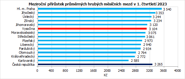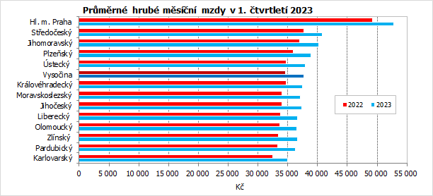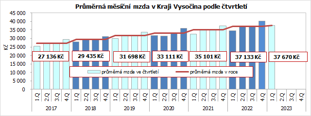 Na Vysočině dosáhla průměrná hrubá měsíční nominální mzda na přepočtené počty zaměstnanců za první tři měsíce roku 2023 částky 37 670 Kč, což proti stejnému období předchozího roku představuje nárůst o 9,0 %, v absolutním vyjádření se jedná o zvýšení o 3 104 Kč.