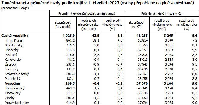 Počet zaměstnanců na republikové úrovni mírně vzrostl, na regionální úrovni se alespoň nepatrně zvýšil v devíti krajích (výrazněji pouze v Praze), mírně zaměstnanost poklesla v Jihočeském, Ústeckém, Pardubickém, Zlínském kraji a na Vysočině, kde se oproti prvním třem měsícům roku 2022 počet zaměstnanců snížil o 0,2 %.