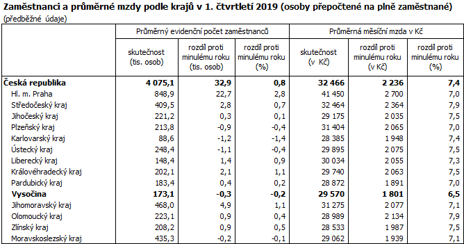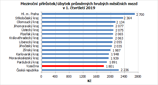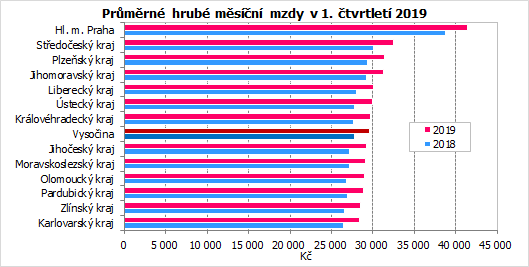 Na Vysočině dosáhla průměrná hrubá měsíční nominální mzda na přepočtené počty zaměstnanců v prvních třech měsících roku 2019 částky 29 570 Kč, což proti stejnému období předchozího roku představuje nárůst o 6,5 %, v absolutním vyjádření se jedná o zvýšení o 1 801 Kč.