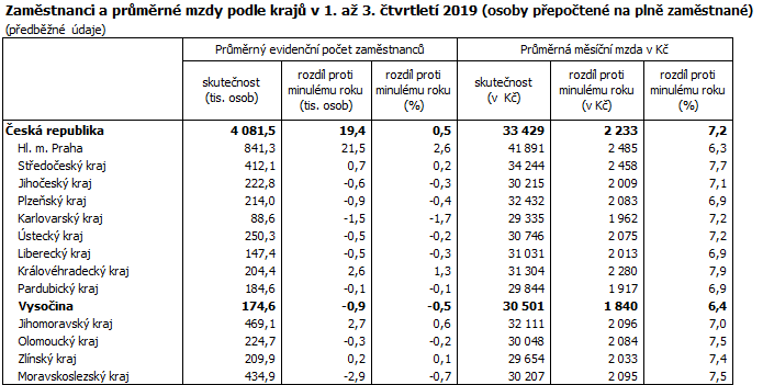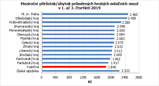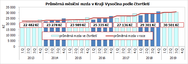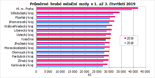 Na Vysočině dosáhla průměrná hrubá měsíční nominální mzda na přepočtené počty zaměstnanců v prvních devíti měsících roku 2019 částky 30 501 Kč, což proti stejnému období předchozího roku představuje nárůst o 6,4 %, v absolutním vyjádření se jedná o zvýšení o 1 840 Kč.