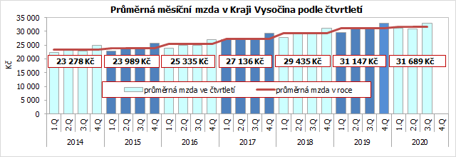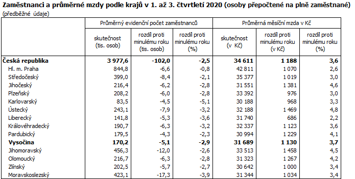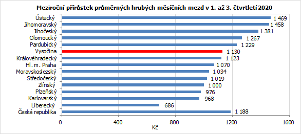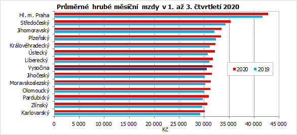Na Vysočině dosáhla průměrná hrubá měsíční nominální mzda na přepočtené počty zaměstnanců v prvních devíti měsících roku 2020 částky 31 689 Kč, což proti stejnému období předchozího roku představuje nárůst o 3,7 %, v absolutním vyjádření se jedná o zvýšení o 1 130 Kč.