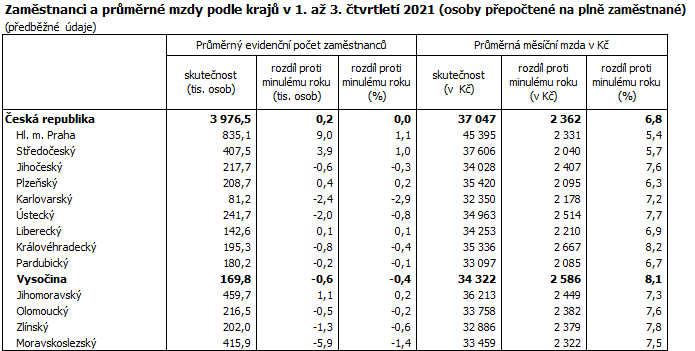 Počet zaměstnanců na republikové úrovní stagnoval, ve většině regionů však došlo k poklesu zaměstnanosti, výrazněji zaměstnanců přibylo pouze v Praze a Středočeském kraji. Nejhlubší úbytek byl zaznamenán v Karlovarském kraji (o 2,9 %). Na Vysočině se oproti prvním šesti měsícům roku 2020 počet zaměstnanců snížil o 0,4 %, v mezikrajském srovnání to je pátý nejvyšší úbytek.