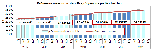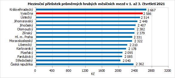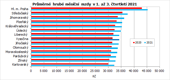Na Vysočině dosáhla průměrná hrubá měsíční nominální mzda na přepočtené počty zaměstnanců za prvních devět měsíců roku 2021 částky 34 322 Kč, což proti předchozímu roku představuje nárůst o 8,1 %, v absolutním vyjádření se jedná o zvýšení o 2 586 Kč.